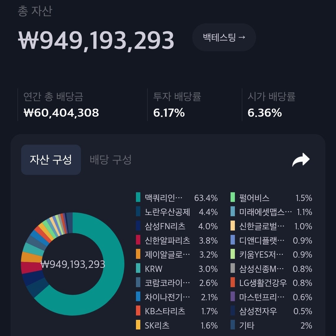 은퇴 후 50년, 매년 1억원의 현금흐름으로 돈 걱정 없는 노후를 준비하고 있는 연금부자입니다. 연금부자의 삶을 위해 제가 가장 중요시하는 게 국민연금인데, 국민연금 다음으로 중요시하는 것은 "절세계좌를 활용한 배당주 투자"입니다.현재 제 투자자산의 63.4%를 차지하고 있는게 맥쿼리인프라인데, 대략 53,829주를 보유하고 있고, 평단가는 11,320원 정도 됩니다. 맥쿼리인프라는 매년 6월과 12월 말을 배당기준일로 하여, 8월과 그 다음해 2월에 배당금을 지급해주고 있습니다. 작년 12월 말 기준 제가 보유하고 있었던 맥쿼리인프라 주식은 45,089주였는데, 최근 한국예탁결제원의 우편물이 집으로 왔네요 ^^배당주 위주로 투자를 하고 있다보니 심심치않게 한국예탁결제원의 우편물을 받는데, 우편물을 열어봤다 깜짝 놀랬습니다. 너무 좋아서 콧노래가 저절로 나오더군요.배당통지서에 찍힌 배당금은 17,133,820원이었습니다.제가 배당주 투자를 즐겨하는 이유가 배당금 받는 재미가 아닐까 싶네요. 아 물론 심심치 않게 시세차익도 볼 수 있어서 일거양득입니다. 투자에는 정석이 없다고 하는데, 제가 배당주 투자를 4년째 하면서 느끼는 것은 “여유자금으로 똘똘한 배당주를 절세계좌에서 쌀 때만 분할 매수해서 배당금 받고 있다 주가 오르면 분할매도하면, 배당금으로 돈 벌고, 시세차익으로 돈 벌 가능성이 아주 크다는 것”입니다. 간혹 제가 투자하는 종목 중 저에게 주가 손실을 경험하게 하는 종목이 있을 때, 주변 사람에게 이야기하는 경우가 있습니다. 내가 이만큼 손해를 보고 있는데, 참고해보라고. 그 경험을 통해서 느꼈던 게, 아~ 사람들은 주식투자를 무슨 번갯불에 콩 구워 먹듯이 한다는 것입니다. 제가 신통방통한 점쟁이도 아니고, 주가가 언제 오를지? 언제 내릴지? 알 수 있을까요? 최소 1년을 보면서 똘똘한 배당주를 쌀 때만 절세계좌에서 분할 매수하면, 주가 하락으로 손실이 발생해도, 절세계좌 혜택과 배당금으로 만회할 가능할 가능성이 크다고 저는 생각합니다. 아니 저는 그렇게 주식 투자해서 돈을 벌었습니다. 판단은 각자의 몫이니 신중하게 투자하시기 바랍니다. 그나저나 오늘 입금될 배당금 17,133,820원으로 뭐할까요?