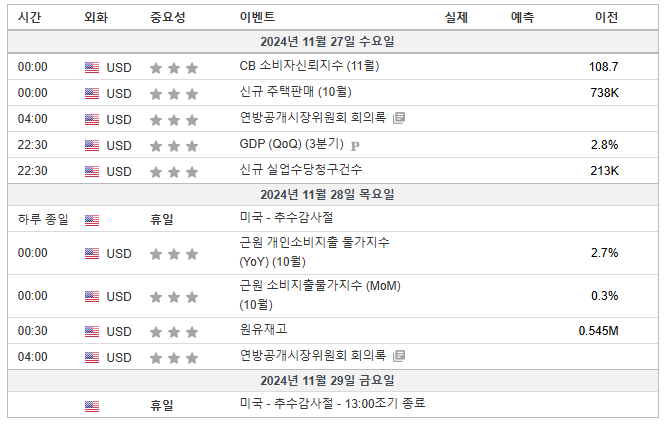 11월 미국증시 주요일정[11/25~11/29](Feat.실적발표, 경제일정, 10월 PCE 물가지수, FOMC회의록, 추수감사절 휴장, 블랙프라이데이)