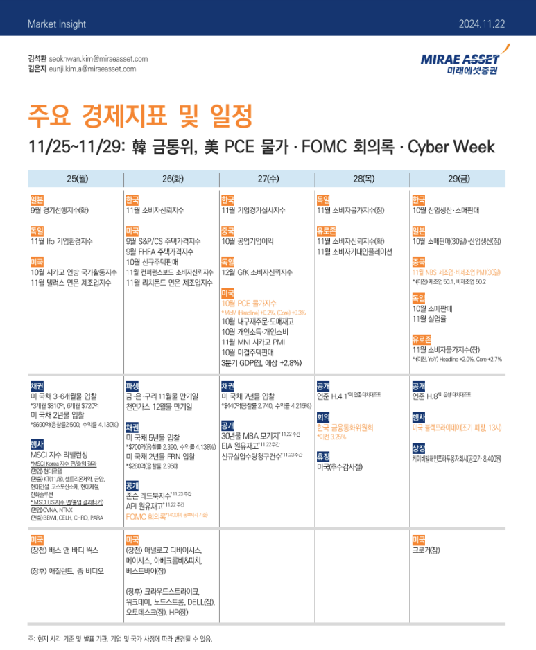 안녕하세요 허사장입니다. 이번주 주요 경제일정을 알려드리겠습니다.11월 25일(월) 10월 시카고 연방 국가 활동 지수 11월 댈러스 연은 제조업지수 채권 미 국채 3·6개월물 입찰 미국 채 2년물 입찰 행사 MSCI 지수 리밸런싱 ------------------------------------------------ 11월 26일(화) 9월 S&P/CS 주택 가격지수 9월 FHFA 주택가격지수 10월 신규주택 판매 11월 컨퍼런스보드 소비자신뢰지수 11월 리치몬드 연은 제조업 지수 파생 금·은·구리 11월물 만기일 천연가스 12월물 만기일 채권 미 국채 5년물 입찰 미 국채 2년물 FRN 입찰 공개 존슨 레드북 지수 *11.23 주간 API 원유재고 *11.22주간 FOMC 회의록 ------------------------------------------------ 11월 27일(수) 10월 PCE 물가지수 10월 내구재 주문·도매재고 10월 개인소득·개인소비 11월 MNI 시카고 PMI 10월 미결주탁팬마 3분기 GDP(예상 +2.8%) 채권 미 국채 7년물 입찰 공개 30년물 MBA 모기지 EIA 원유재고 신규실업수당 청구건수 ------------------------------------------------ 11월 28일(목) 공개 연준 H.4.1 *미 연준 대차대조표 회의 한국 금융통화위원회 *이전 3.25% 휴장 미국(추수감사절) ------------------------------------------------ 11월 29일(금) 공개 연준 H.8 *미 은행 대차대조표 행사 미국 블랙파라이데이(조기 폐장, 13시)11월 25일(월) 장 시작 전 : 배스 앤 바디 웍스 장 마감 후 : 애질런트, 줌 비디오 ------------------------------------------------ 11월 26일(화) 장 시작 전 : 애널로그 디바이시스, 메이시스, 아베크롬비&피치, 베스트바이 장 마감 후 : 크라우드스트라이크, 워크데이, 노드스트롬, DELL, 오토데스크, HP ------------------------------------------------ 11월 27일(수) 장 시작 전 : 장 마감 후 : ------------------------------------------------ 11월 28일(목) 장 시작 전 : 장 마감 후 : ------------------------------------------------ 11월 29일(금) 장 시작 전 : 크로거 장 마감 후 : ------------------------------------------------이번주는 3분기 GDP, FOMC 회의록, 10월 소비자 PCE 근원 물가지수 발표가 있습니다. 아무래도 금리에 민감한 영향을 미치는 지표들이다 보니 지켜보아야 겠네요. FOMC회의록에서는 연준 위원들이 어떠한 방향으로 발언을 하였는지 살펴 볼수 있을거 같습니다. 11월 28일 목요일은 미국의 추수감사절로 휴장이며, 11월 29일은 추수감사절로 인해 조기 휴장입니다. 사실상 미국은 목요일부터 일요일까지 휴가 기간에 들어 간다고 보면 될거 같네요. 블랙프라이데이를 맞이하여 사고 싶은 물건은 있지만, 환율이 1400원대를 넘나드는지라 가격적 메리트가 충분할지 모르겠네요.. 그래도 좋은 딜이 뜨는지 지켜보아야 겠습니다. ------------------------------------------------ 글 내용이 좋으셨다면 좋아요 한번 눌러주세요. 좋아요와 댓글은 제가 글을 적는 원동력이 됩니다. 팔로우도 해주시면 힘이 팍팍 날거 같습니다. ------------------------------------------------ 더 자세한 내용은 블로그에 정리되어 있습니다. 방문해서 읽어주시면 감사하겠습니다. https://blog.naver.com/gjrksp/223671800885------------------------------------------------ 궁금한점은 채팅방에서 물어봐주시면 답변해 드리겠습니다. https://link.therich.io/5yLNXByGPpYAuoVM811월 미국증시 주요일정[11/25~11/29](Feat.실적발표, 경제일정, 10월 PCE 물가지수, FOMC회의록, 추수감사절 휴장, 블랙프라이데이)