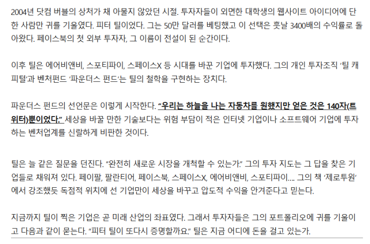1. 피터 틸이 누구? 페이팔 마피아 보스 피터 틸은 유니콘 기업을 발굴하고 투자 2~3000% 수익을 보는 유명...